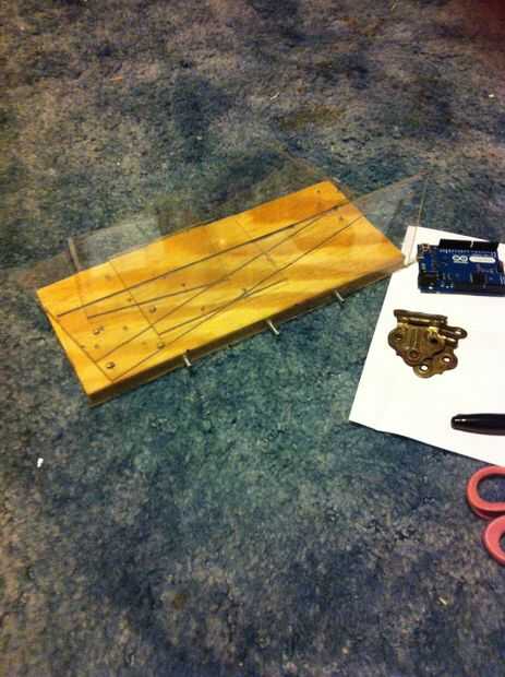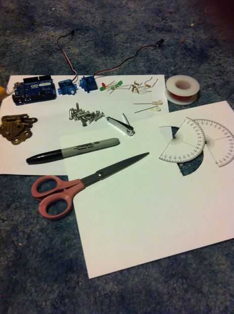 28cmx11.5cmx1cm trozo de madera. 28cmx9cm(2),11.5cmX9cm(2) y 28cmx11.5cm(1) Plexiglas. dos pares de bisagras pequeñas. Tornillos. Regla con unidades métricas. Sharpie. Dos agujas de coser 1,75 largo. Alambre de cobre fino. Arduino (preferentemente mini o nano, no importa). Alambre aislado como. Tijeras. Papel stock de la tarjeta. Transportador file(included) de imagen. 5 resistencias de 100 ohm. mismo color 4 y 1 color diferentes LEDs. servo pequeño 2 motores http://www.jameco.com/webapp/wcs/stores/servlet/Product_10001_10001_2150416_-1. pistola de pegamento. Clippers.