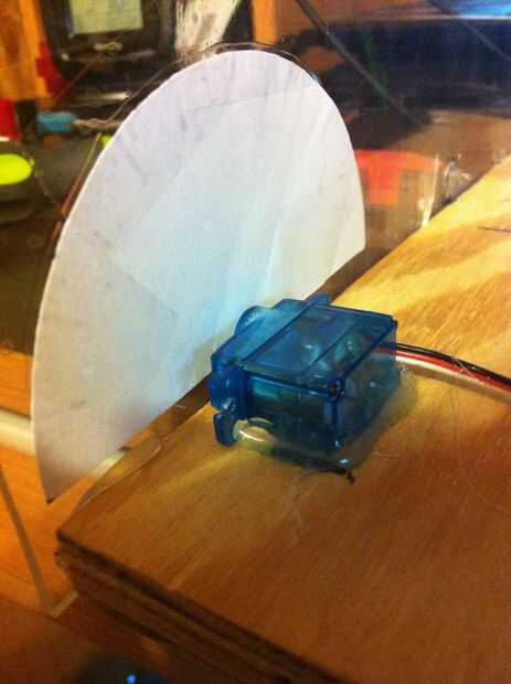 Tornillo en la parte frontal y a partir de la línea de fondo justa encima de un transportador de recorte. Marca donde termina medir otra 1cm y línea de los otros y marca donde termina. Con los dos transportadores alineados tomar los servos y alinee la rueda de fijación con el corte un semicírculo en cada transportador. Donde es la marca sobre el vidrio. Desde donde marcaste Mantenga los servos en lugar y trazar la forma del orificio de cada servo en el otro lado de la plexiglás. En una mesa toman los transportadores y alinee el semicírculo con la rueda de fijación y trace a la mitad del orificio de llave en el transportador y recortarlo. Puede ver en la foto para la referencia. Servos de cola en su lugar con alambre de conexión hacia izquierda. Usar sharpie para hacer marcas de segundo cada 3 grados como se muestra. Conectar transportadores con la cinta.