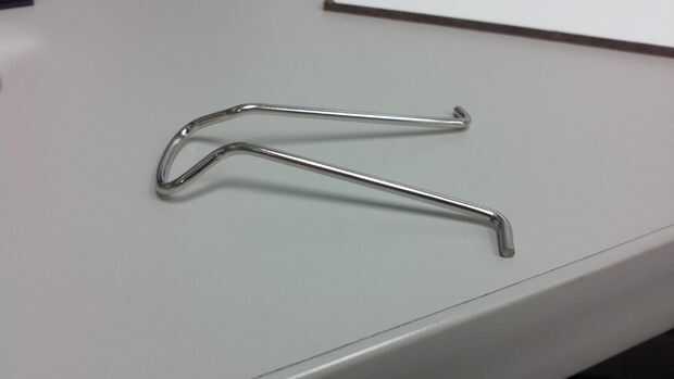 A pesar de que este es uno de los pasos más cruciales, es muy fácil. Acaba de tomar el metal dos 'tiradores' del clip binder. Ponerlas en una mordaza y fije el extremo redondeado hasta donde se dobla. Golpee con un mazo de martillo hasta que tenga unos 20 grados de curva en la parte. Repita con ambos dedos.