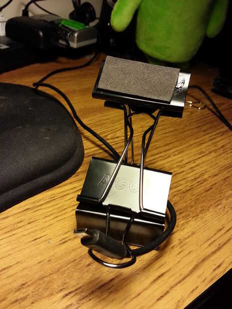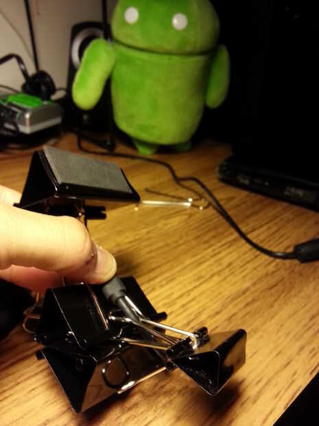 Si encuentra que el teléfono se desliza fuera de la base demasiado fácilmente, sólo encuentra un pequeño clip y fíjela como se muestra. Sin embargo, esto significa conseguir creativo con el cable, aunque el cable sirve para mantener el teléfono en lugar de todos modos. Jugar con él y encontrar algo que te gusta.