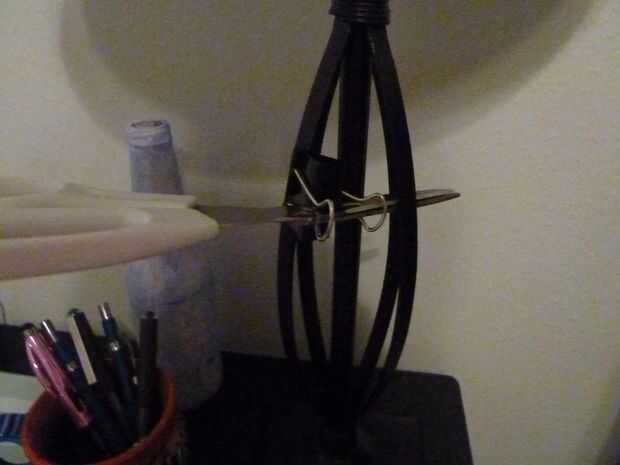 No tuve donde poner mis tijeras. Así, adjunta un clip binder a mi lámpara y deslice las tijeras a través. Funciona como un encanto!