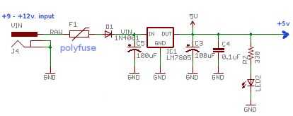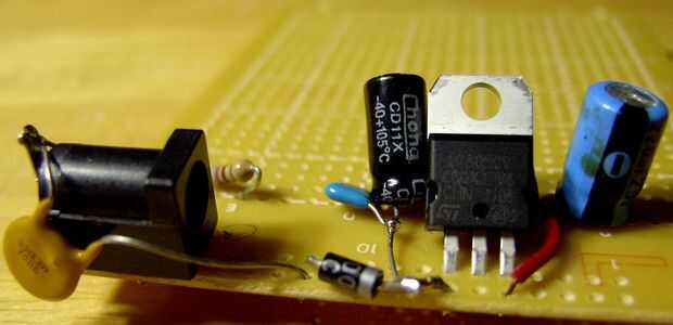 sección de la fuente. Hay tres condensadores, un indicador LED y una
