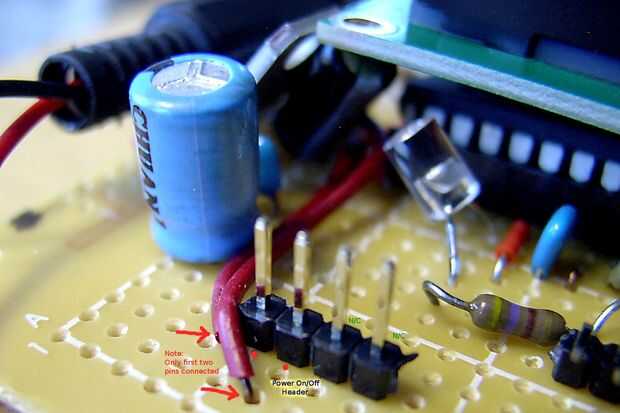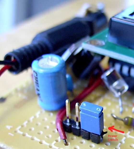 La entrada de + 5 voltios se conecta al pin izquierdo de la cabecera de encendido y apagado,