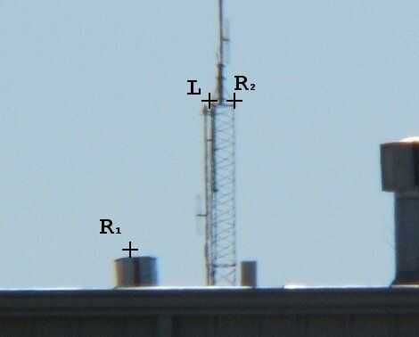 Con esta información en mano estaba lista para colimar! Lo primero primero, montara el binos en un soporte sólido. Tomé la configuración fuera y miras una torre distante. Colocar el buscador entre el ocular y el ojo hace dos cosas, en primer lugar, aumenta la imagen por el producto de los dos dispositivos (6 x finder y un binocular de 20 x = 120 x) en segundo lugar, como con cualquier incremento en la ampliación, restringe el campo de visión. Esto tiene el efecto de obligar a uno a ver el centro de los binoculares, el campo de visión. Con el buscador alinea el lado izquierdo de los binoculares en una torre en la distancia. A continuación que miras por el lado derecho de los prismáticos. El lugar que vi se indica como "R1" con punto "L" ser el lugar de la izquierda de la mitad de los gemelos fue apuntado. He seleccionado uno de los tornillos de colimación y dio una vuelta pequeña (menos de 1/8 de una rotación) que causó la imagen cambiar de puesto lateralmente. Tratar de los tornillos de colimación causado a la imagen cambiar de puesto verticalmente. Para hacer el cuento largo, me ha recordado el derecho de la mitad de mis binoculares al punto indicada por "R2". Durante el proceso, varias veces revisado tanto la óptica derecha e izquierda para comprobar mis progresos. Con colimación terminada llena los orificios de los tornillos de colimación de masilla de plomería.