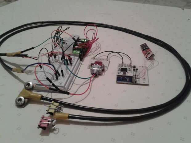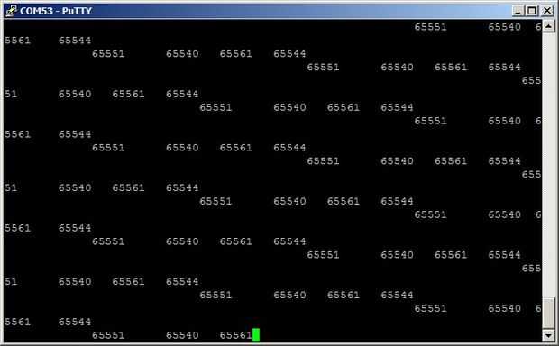 Se preparan los electrodos activos. Conecte a la neurointerface móvil. Neurointerface está en pruebas y ajustes de etapa (este es otro proyecto). El proyecto fue capaz de usar sólo uno de los cuatro canales de recolección de señales de EEG. En cambio, BT canal para transmitir datos a un laptop usando un canal USB. Datos USB se transmiten en un canal en formato de texto a la velocidad 460800 (bits / seg). Una línea contiene cuatro números - los siguiente valores de las señales de cuatro canal. Aquí es cómo se ve en la pantalla del terminal masilla: