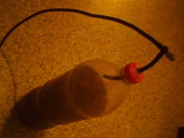 2:Next colección de materia de decaerse, reunir todo lo necesario, pellets de conejo son una buena fuente de material rico de metano, como excrementos de caballo, cerdo y vaca, ware guantes y gafas durante la manipulación de dicho material ya que presenta un riesgo para la salud obvio si un chorro entra en el ojo o en un labio, utilice un pasador de madera o un palillo para empujar dicho material en la pequeña abertura de la botella sí mismo llenan alrededor a medio camino a la cima , añadir agua justo por debajo del punto en donde hay tuberías de la parte superior sobresalen dentro de la botella y mezclar todo muy bien con el palo... ahora uso un viejo rag o hierba para limpiar en seco limpie la parte superior de la botella del tornillo de casquillo punto.