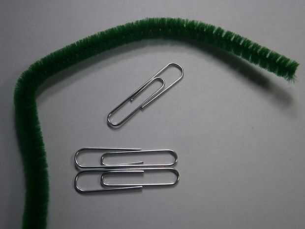 Puede utilizar limpiadores de pipa, clips de papel (esto es lo que usé) o alambre para las piernas. Mida todas las piernas y corte si es necesario para que sean todos iguales en longitud. Algunos patas pueden circundar el condensador estupendo para que un cable puede hacer dos piernas con un corte. Si usted está usando clips de papel, simplemente relajarse cada clip según sea necesario.
