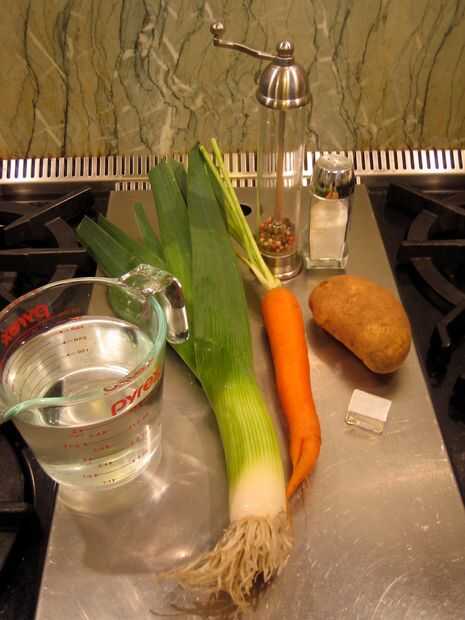 Aquí están los ingredientes: 1 puerro mediano, 1 zanahoria mediana, 1 patata mediana, 1 cucharada de aceite de oliva (se me olvidó incluir en la fotografía-lo siento), 1 cubo de caldo bajo en sodio grandes (elige tu favorita), 2 tazas de agua, sal y pimienta al gusto.