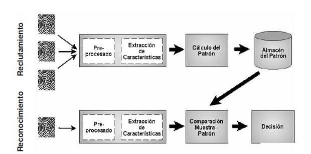 En dicha figura se pueden ver las diferentes fases de un sistema biométrico. Primero se realiza el Liu con la toma de la muestra o muestras del usuario, se preprocesan para mejorar su calidad, se extraen las características más importantes y finalmente se más el patrón del usuario guardándose para posteriores comparaciones. Cuando un usuario deba ser reconocido (autenticación o verificación), se vuelve a tomar una o varias muestras del usuario, se preprocesa, se extraen las características de dicha muestra y finalmente se compara ésta última con el patrón guardado anteriormente para tomar una decisión de reconocimiento.