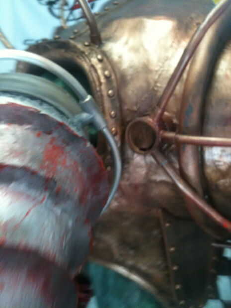 Se puede ver el trabajo de pintura y mi remaches en lugares clave. Los remaches son perlas/piedras de cristal utilizados en frascos para la decoración. Yo sólo caliente había pegado en lugar. El escudo inferior delantero es cartulina y las tiras levantadas alrededor del tanque y hombros franjas de espuma cubiertos con fibra de vidrio. Para las aberturas, he usado espuma cubiertas de tubería que se utiliza en líneas de aire acondicionado de casa