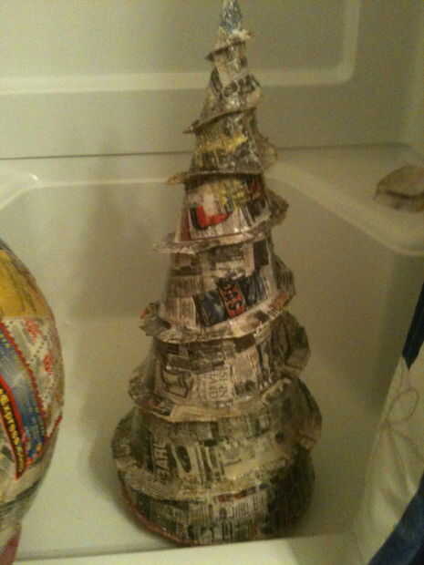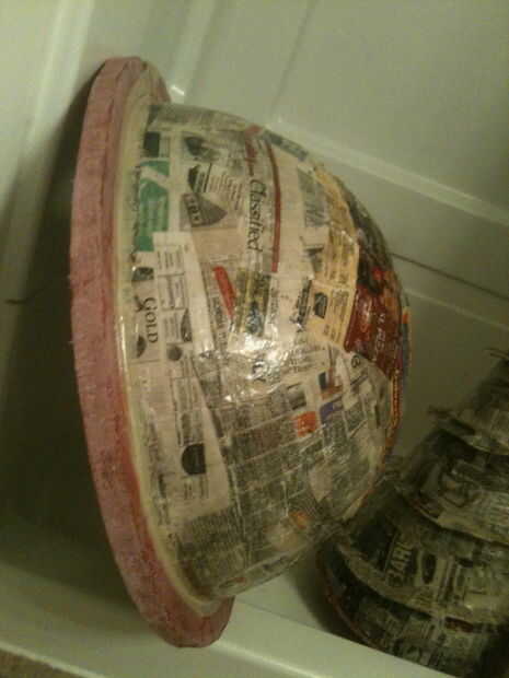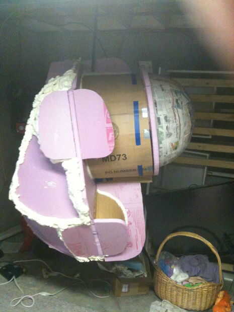 Taladro era cartulina enrollada, cubierto de papel maché, luego recubiertas de resina. Con la resina húmeda, tiré un poco de arena en a para darle una textura de metal gastada. Para la cúpula, tomó una pelota de ejercicio de 24" y cubre la mitad de ella en papel mache luego resina. El anillo es tablero de aislamiento de espuma