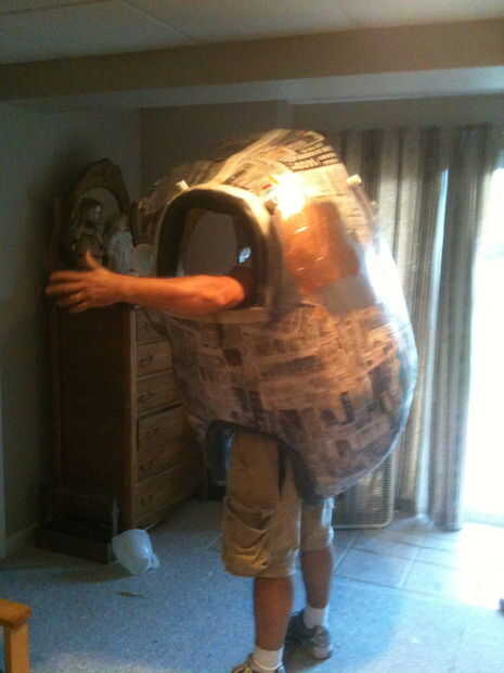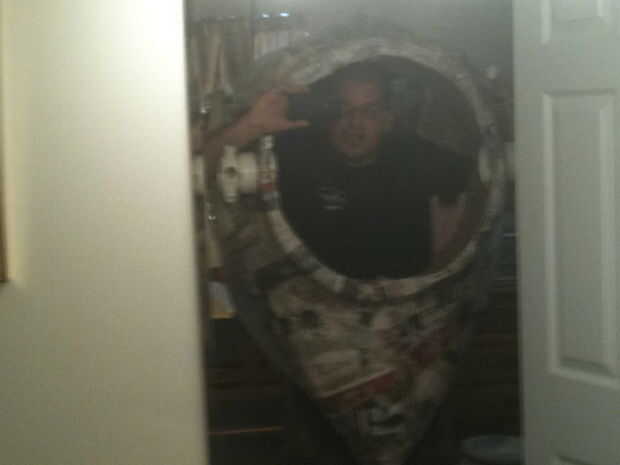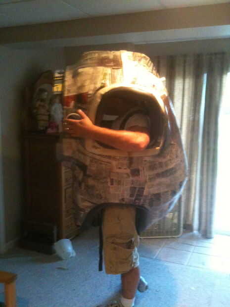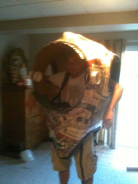 Una vez que el traje se lija a la forma, la parte más difícil llegó a abrir para usar. Primero corté una sección en la parte inferior, que va como una camisa. Entonces abrí el interior un poco a la vez para que sea cómodo de llevar. Os adjunto una mochila vieja al interior, y eso es más o menos como usted lo usa. El traje entero también tiene cubierto en papel maché y después en fibra de vidrio y resina