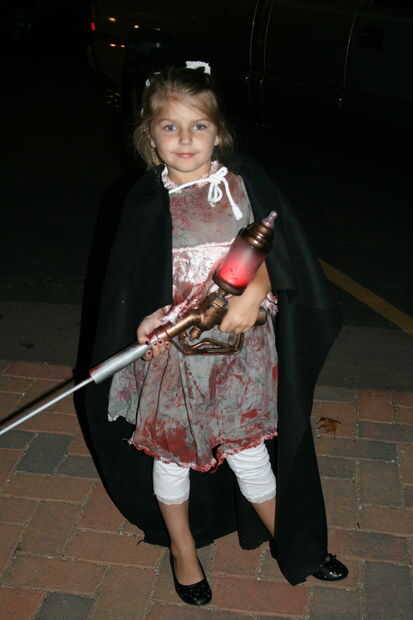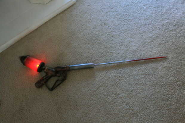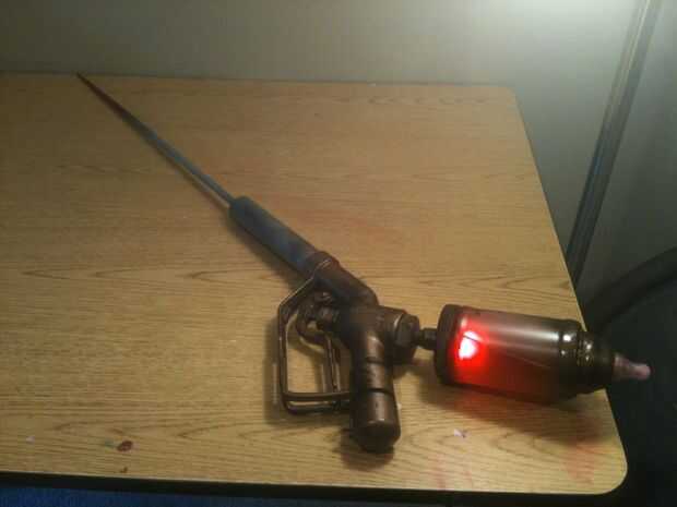 Hecho la jeringa de la bomba de gas antigua manejar fuera de ebay. Algunas piezas de plomería, tarro de mantequilla de cacahuete y un LED y tenerlo. Vestido fue adquirido forma buena voluntad y rasgado para arriba para ver viejos y desgastados. Poco de sangre falsa no duele.