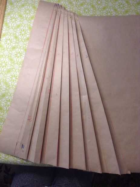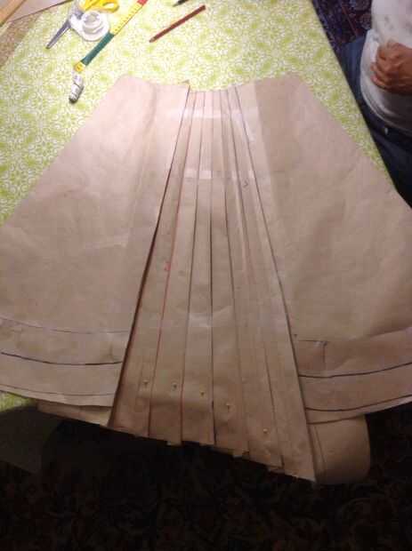 En primer lugar, usted necesitará decidir cuánto quieres hacer los pliegues. Por ejemplo, de 3 pulgadas. Tome otro pedazo del redacción papel y dóblalo en plisados del cuchillo de su tamaño deseado. Parada cuando tenga 7. Coloque el papel plisado a una parte de su patrón de la falda. Los pliegues son incorporados en lugar de parte del patrón. Para mantener el tamaño de la falda de la cintura, pliegues tienen que estar en un ángulo (como si pliegues no fueran suficientemente malos). Para mis pliegues, hizo 1/2" en la parte superior y 2" en la parte inferior, asegúrese de que doblarlo correctamente. Una vez más, dependiendo del tamaño de su cintura, las mediciones de los pliegues cambiará para que siga proporcionado a usted.