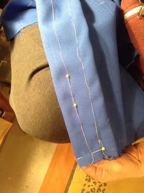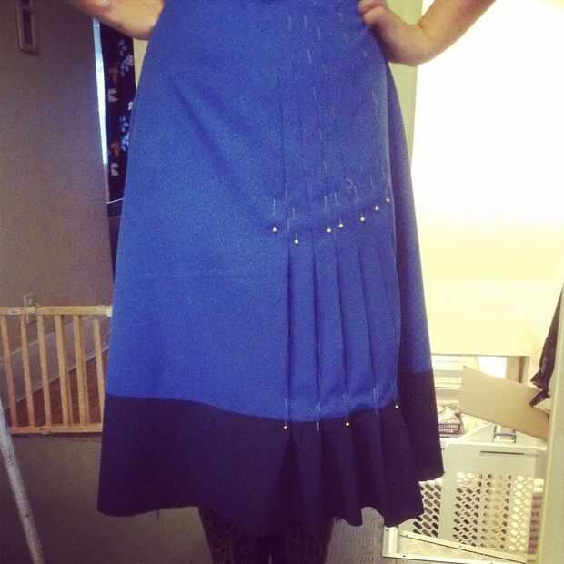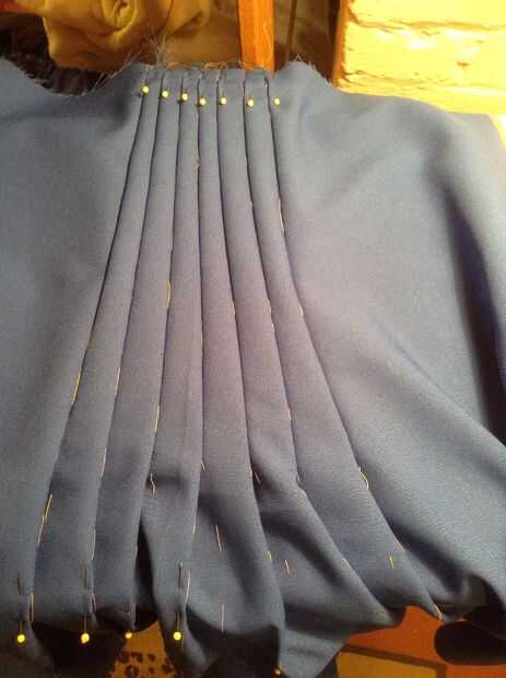 Hilvanar los pliegues, los pines juntos y coser a lo largo de la línea basted. Sólo cosí al punto medio de la falda para permitir que la parte inferior al flujo después de planchar hacia abajo.