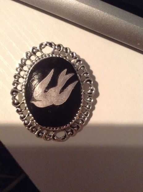 Después de haber hecho una forma que encaja en la base y es suficiente en la parte superior había redondeada, devolver un poco de horneado y enlace en la parte plana de la arcilla y en el cameo. Suavemente empújelo en su lugar. Después de hornear el lugar de la arcilla el pájaro en el centro y haga espuma Mod Podge por todas partes.
