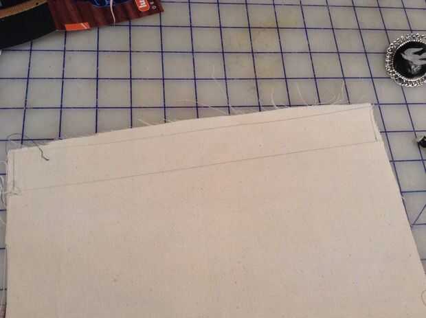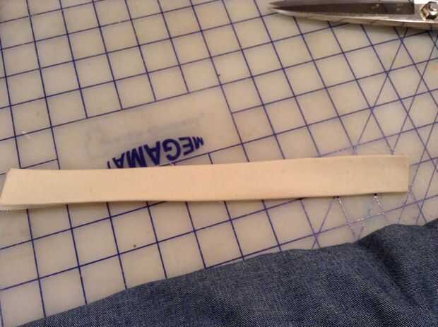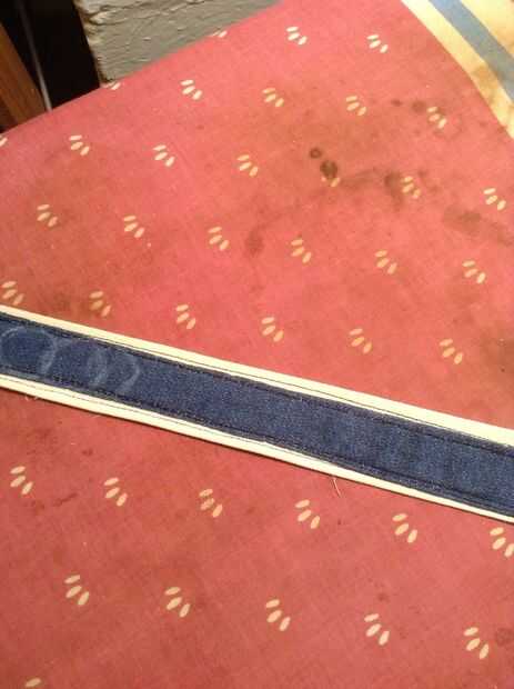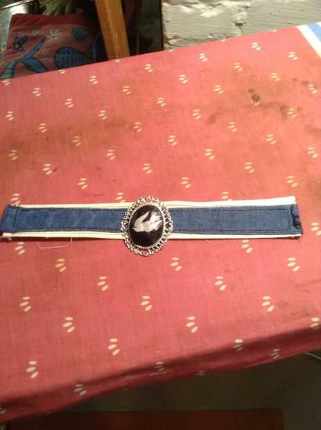 Para el collar, encontré algunos azul mezclilla y lona. Corté dos tiras rectangulares de cada uno, el azul es ligeramente más delgado que el blanco. He añadido un centímetro de margen y el hierro que parte a hacer costura abajo más fácil. El. Cosido por el dobladillo y coser la parte azul en el blanco. Me envuelve la pieza de mi cuello y marcado donde quería poner mis broches. Luego cosido en los broches de presión y coloca el cameo en el medio para asegurarse de que cabe bien.