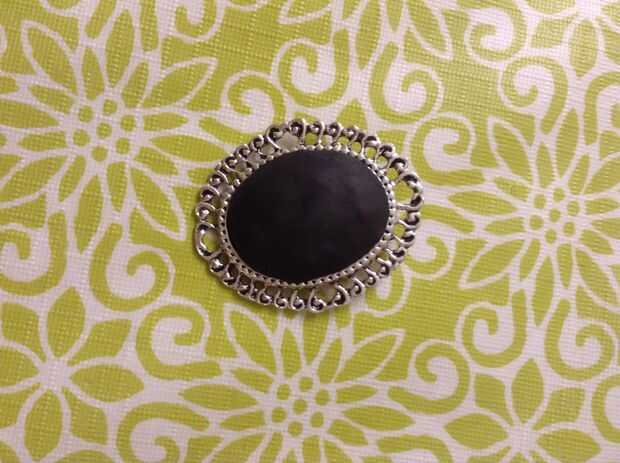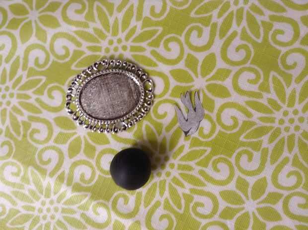 Empecé a hacer el camafeo con una base metálica que recogí en una joyería local. Imprimí una foto del diseño de pájaro y comenzó a hacer una forma redondeada para actuar como una base para camafeo con Sculpey negro.
