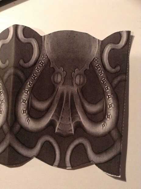 Con la resaca papel plantilla de artesanía (usted puede conseguir aquí http://vigors.jimdo.com/choose-your-vigor/) y el programa Pepakura (usted puede conseguir que aquí http://www.tamasoft.co.jp/pepakura-en/download/viewer.html) imprima la primera página en el papel de la impresora regular y traza la forma de pulpo. Si lo desea, puede hacer todo en el arte de papel, o continuar con este método.