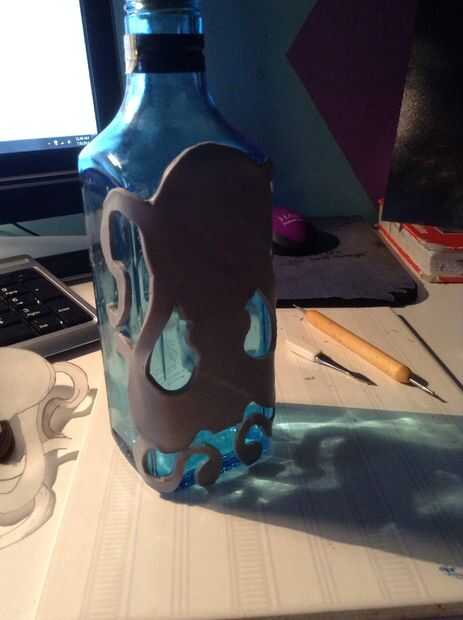 Aquí he recogido hacia fuera una botella de Bombay Sapphire de 375 mL de Ginebra del LCBO. Retire todas las etiquetas de sus botellas solicitadas. Es naturalmente de color azul que me ahorra un paso, pero si no es tuyo, te diré cómo teñir para que sea un color diferente. Luego coloque el pulpo de arcilla base en los lados.
