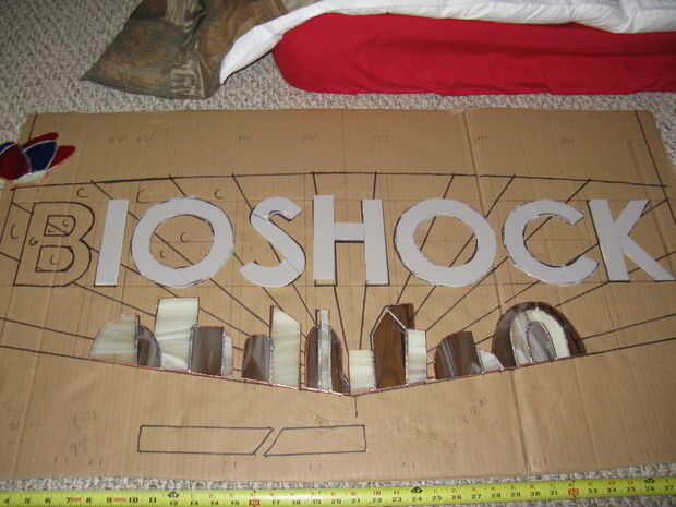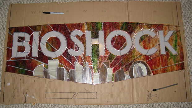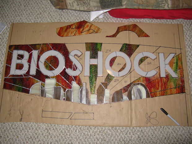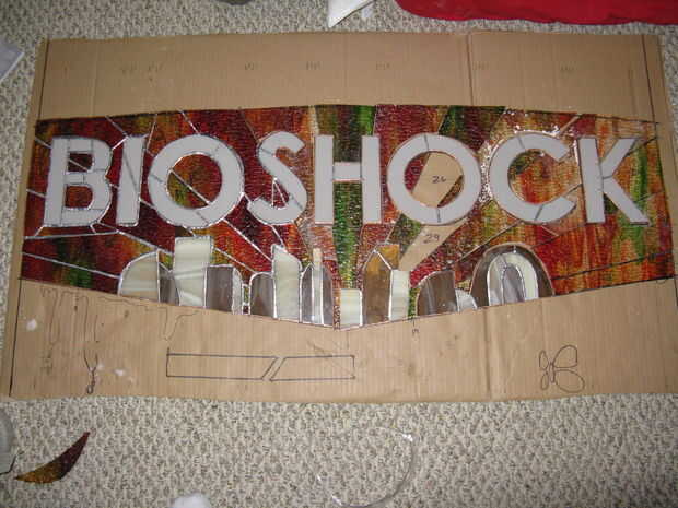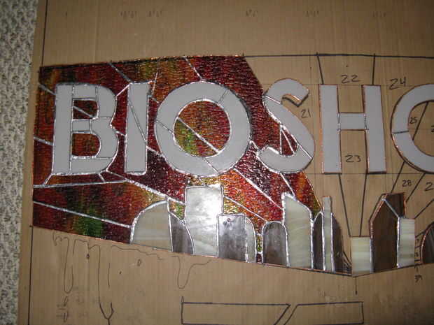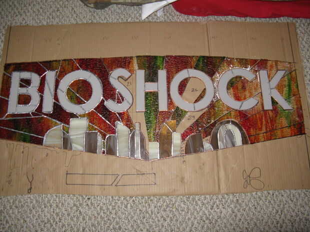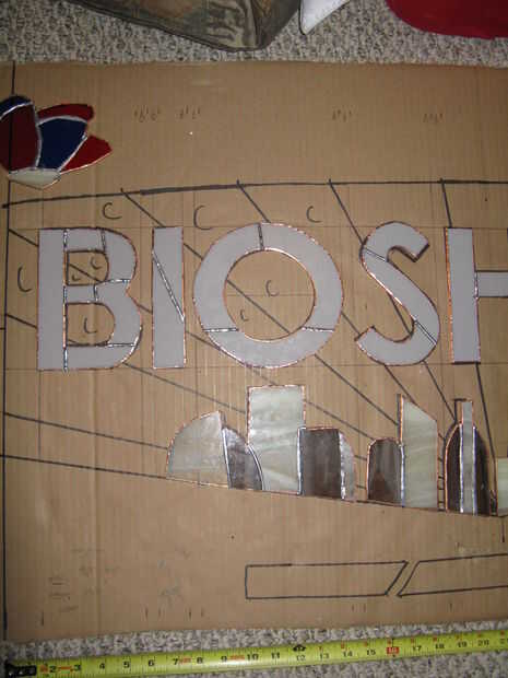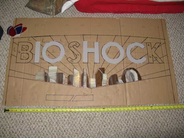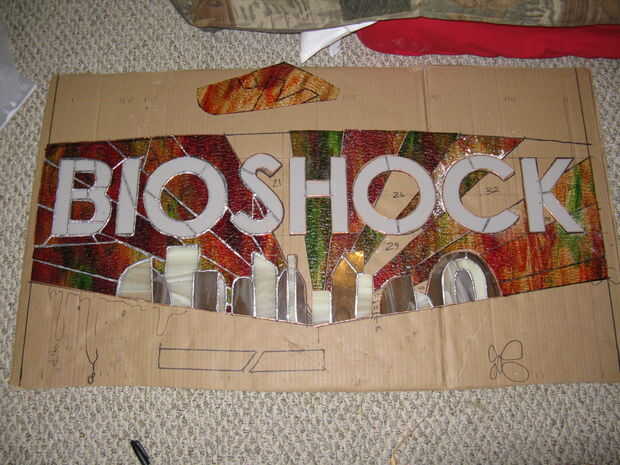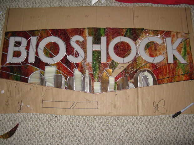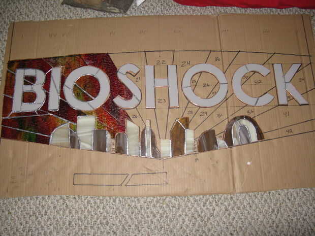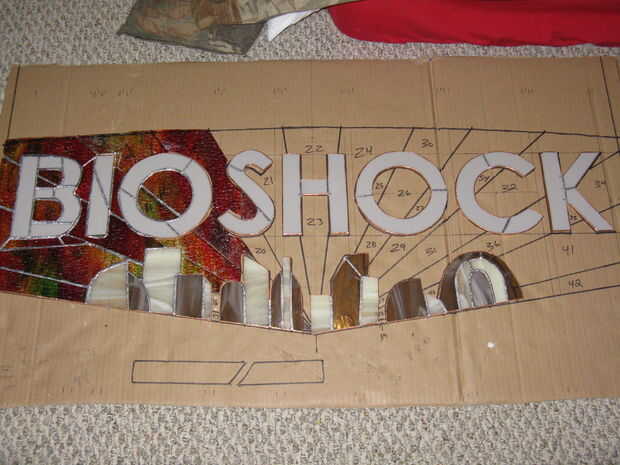 lo primero que hice fue ir en internet tiene un pedazo de papel tamaño BIOSHOCK insignia luego medir en cm y convertido en escala a la pieza de cartón se muestra. también esto era mi pieza de vidrieras de abetos muy que tuve que comprar todas las cosas para hacerlo que era de unos $500 para todas las cosas incluso el vidrio a una tienda de vidrieras. tienen kits se pueden comprar acabo de cosas al azar para comenzar. Utilicé un cortador de cristal, un molinillo de vidrio, cinta de cobre, soldado y pluma de soldado y de cristal grueso de su elección.