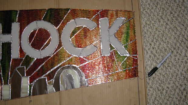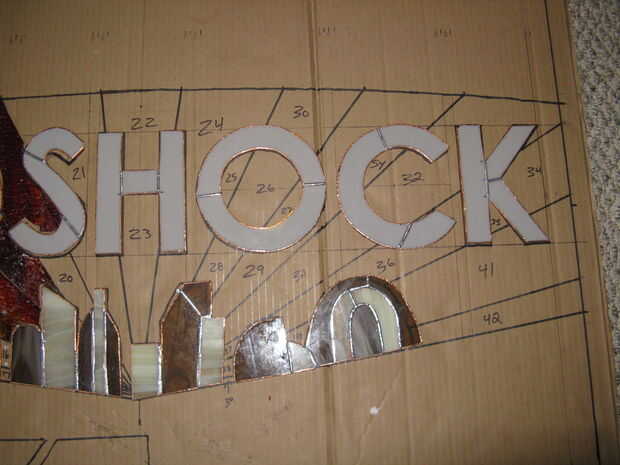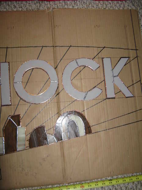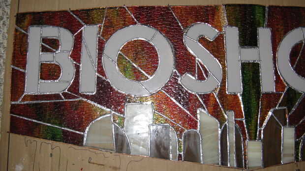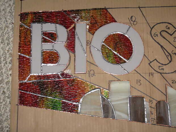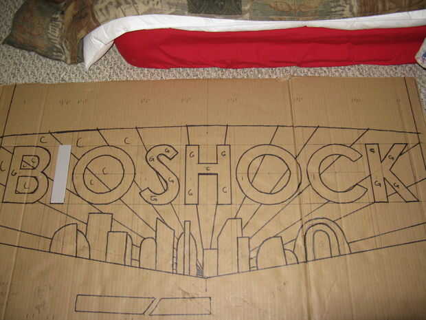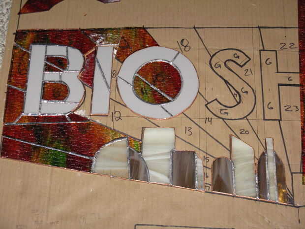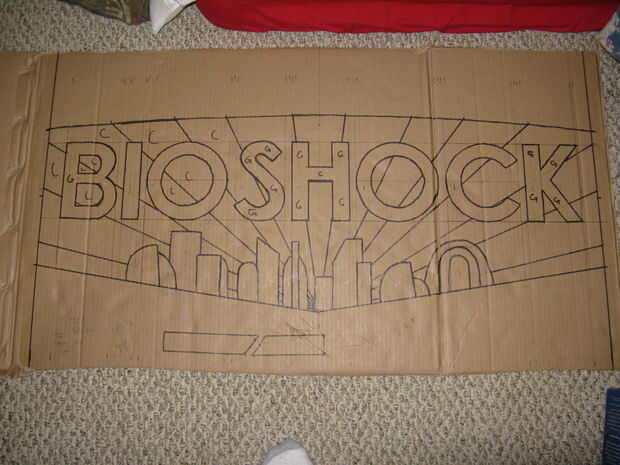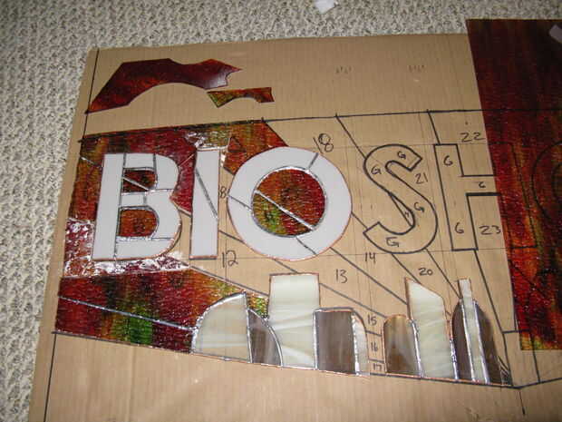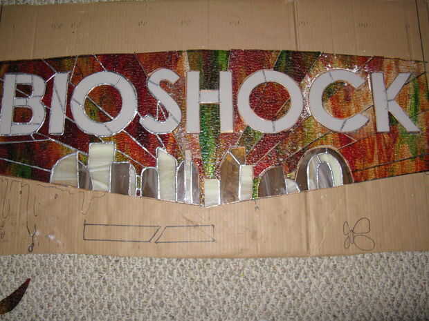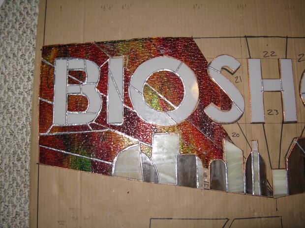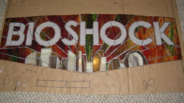 lo primero que hice fue ir en internet tiene un pedazo de papel tamaño BIOSHOCK insignia luego medir en cm y convertido en escala a la pieza de cartón se muestra. también esto era mi pieza de vidrieras de abetos muy que tuve que comprar todas las cosas para hacerlo que era de unos $500 para todas las cosas incluso el vidrio a una tienda de vidrieras. tienen kits se pueden comprar acabo de cosas al azar para comenzar. Utilicé un cortador de cristal, un molinillo de vidrio, cinta de cobre, soldado y pluma de soldado y de cristal grueso de su elección.