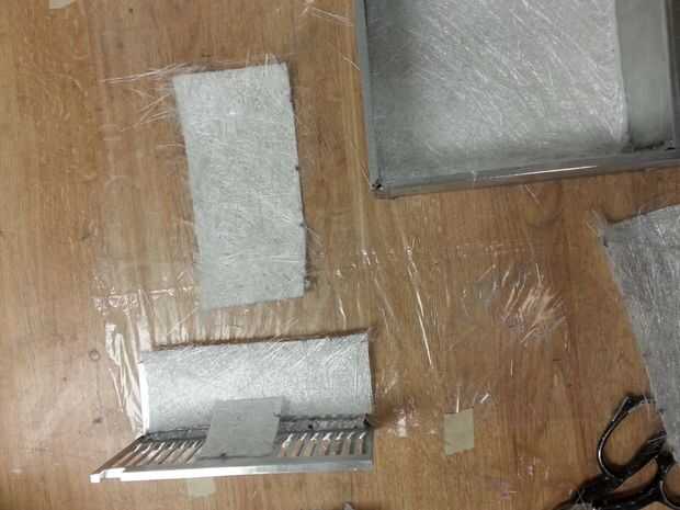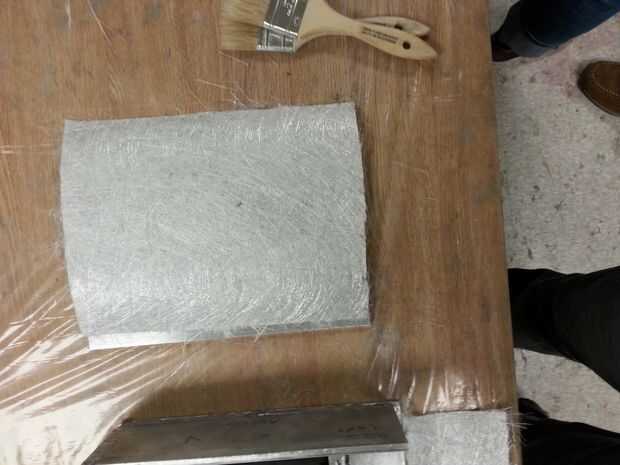 7. Coloque las piezas sobre las partes de aluminio y mojado hacia fuera las fibras por superficies de resina con el pincel. Asegúrese de bien mojado hacia fuera las fibras – volverá transparentes. Otra vez es mejor se aplica la resina extra. Sumerja inmediatamente la pintura pincel es la acetona una vez terminado mojado hacia fuera si usted quiere volver a utilizar el cepillo. De lo contrario dejarlo en un área bien ventilada o fume hood para el poliéster en ella para curar completamente (12 horas). No lo deje en un contador para curará al contador. Descansar sobre el borde de la taza de la mezcla.