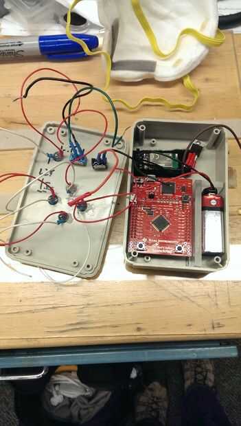 Dentro de la caja, pegue el 1.25" x2.5"x0.375"para que la Junta de Tiva puede descansar en ella y pegue a los otros dos espaciadores en forma de L para contener la batería como se muestra en la foto de arriba.