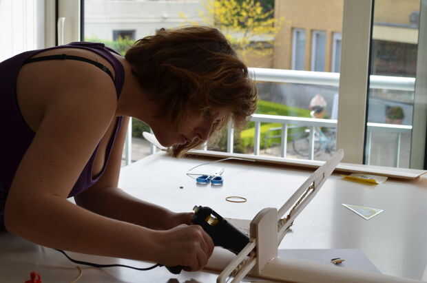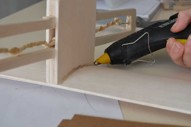 Ahora, los palillos como refuerzo. Hacer los cuatro palillos de unos 9 cm de largo. Fijar con pegamento caliente de la pistola de pegamento con una buena frontera sólida alrededor de ella.