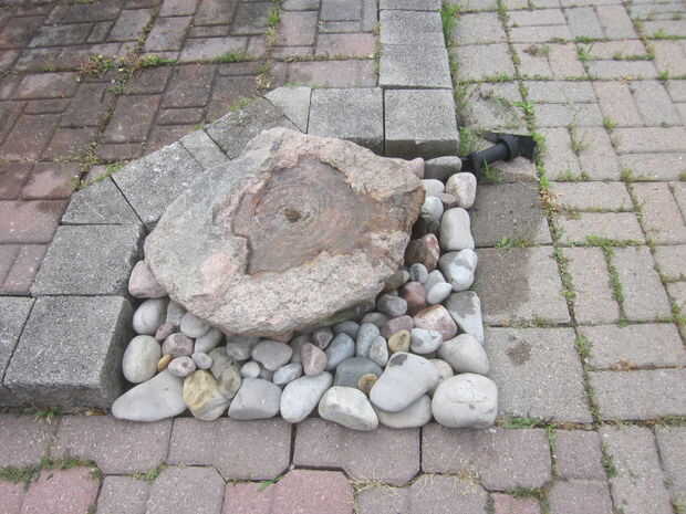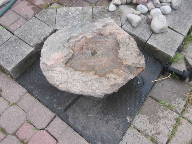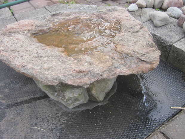 Usted puede hacer esta parte por su cuenta como lo hice, pero puede que desee alguien para ayudarle a colocar la base, particularmente si utiliza granito pesado como el mío. Con la fuente de granito pesado base ' borde', me corrió la manguera por el orificio del centro y bajar con cuidado la base de granito sobre las rocas de apoyo. Encienda la bomba y el uso de pequeñas piedras planas, nivel de la base para que el agua corre sobre el borde donde quieres hacerlo, pero deja un charco de agua en la base.