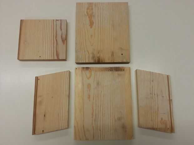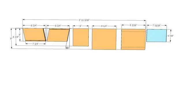 -Corte los paneles laterales a 10 grados a través de dos de los lados de 5" para que coincida con los chaflanes en la parte inferior, la espalda y paneles superiores. Las piezas resultantes deben ser paralelogramos.