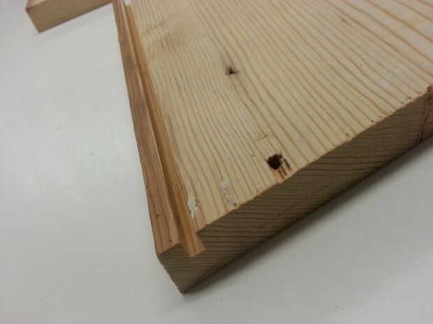 -Corte una ranura ancha de 1/8" a lo largo de un borde largo de ambos laterales. Asegúrese de que se enfrentarán a las ranuras hacia adentro en el cuadro de acabados - vea los dibujos. Esta ranura fijar el panel delantero claro del alimentador.