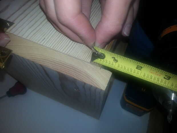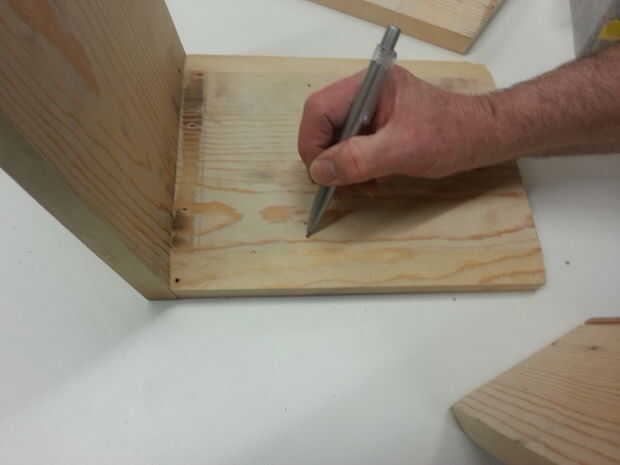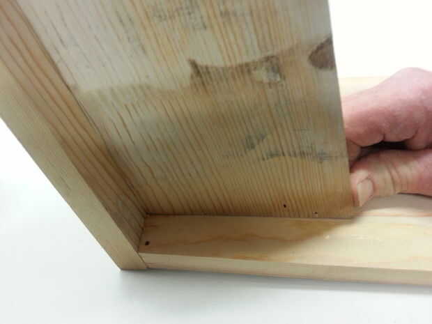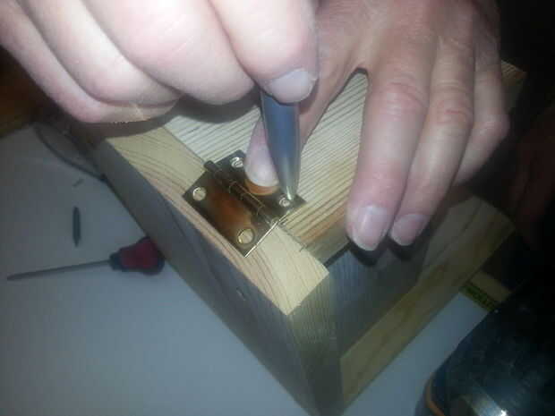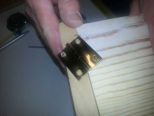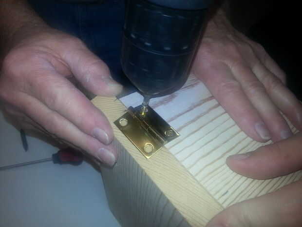 Coloque la tapa en el panel posterior, usando las bisagras. El borde biselado se ajusta contra la parte trasera. Bisagras uso 2 espacian una distancia apropiada. Taladre los agujeros para los tornillos de la bisagra evitar rajaduras.