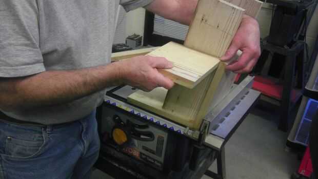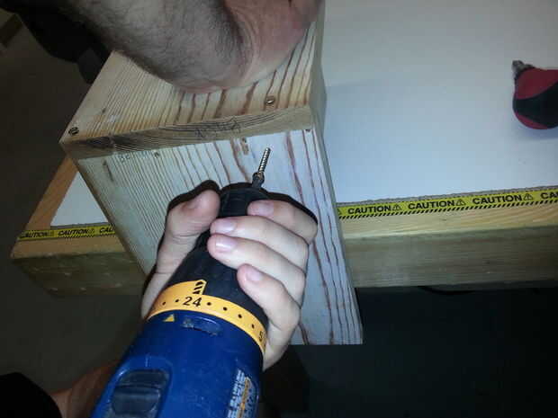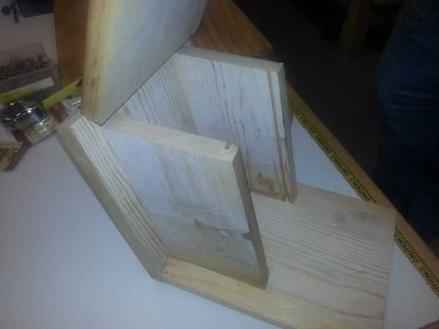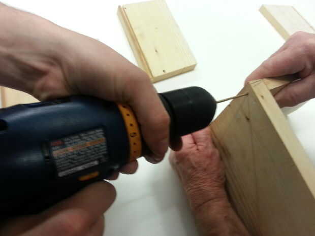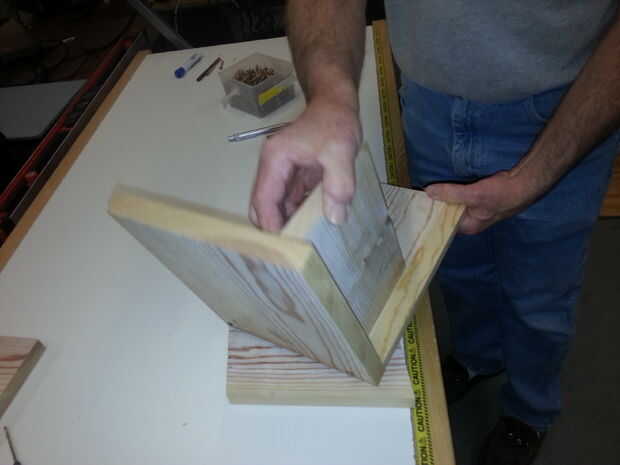 Fije el panel base al panel posterior. El borde biselado del panel base debería ir contra el panel posterior para que la base de las pistas hacia abajo mientras que la parte posterior es vertical. El borde biselado del panel posterior va en pendiente superior hacia la parte posterior del alimentador. Perfore previamente los orificios para evitar la división de madera. Utilice 2 tornillos (y pegamento para madera resistente al agua si se desea).