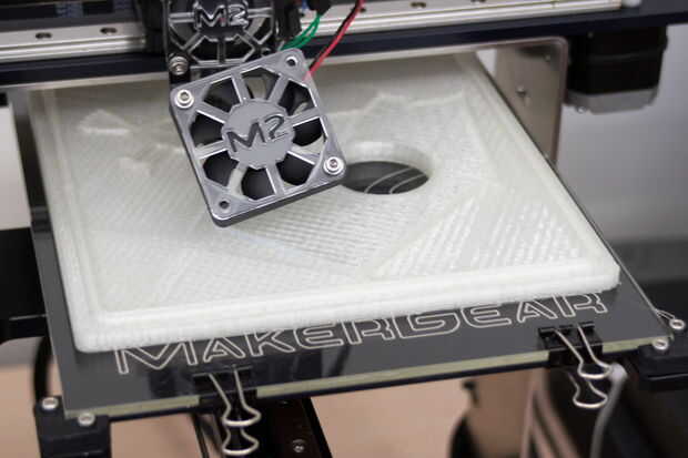 - La espalda y el cuerpo: back.stl. Esto utiliza un poco menos de la placa de construcción de la parte delantera, pero también es bastante alto alrededor del perímetro. No sólo es fundamental la nivelación de la cama, pero la altura significa que cualquier deriva sobre las capas se acumula. El M2 es virtualmente perfecto en la alineación de la capa a capa, por lo que éramos capaces de construir esta parte en 6 horas con extrusión de 0,3 mm, apenas una sola cáscara vertical, relleno de 5% (es decir, el 95% del volumen dentro de una pieza "sólida" es aire) y 3 conchas horizontales.