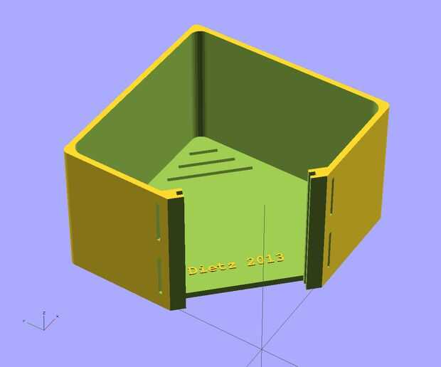 Se utilizó el PLA (ácido poliláctico, un poliéster hecho de materiales renovables) de estas piezas. PLA tiene muchas propiedades muy grandes y debe ser absolutamente conveniente para esta aplicación. Sin embargo, PLA empieza a ablandar en una temperatura bastante baja, y la exposición prolongada a temperaturas superiores a los 140º F, como estar dentro de un coche al sol en un caliente día de verano, puede causar partes a combarse. Las rejillas de ventilación en la espalda y el cuerpo, que son en ángulo para evitar lluvia, deben ayudar a mantener las temperaturas internas moderadas, al igual que la pintura con que te cubrimos el exterior. Las paredes de la solo-cáscara y relleno del 5% del cuerpo también proporcionan una buena rotura de puente térmico para que incluso si una parte consigue lo suficientemente caliente como para sag, el apoyo de la estructura detrás no--por lo menos que es la teoría. Otros plásticos que tienen mayor tolerancia a la temperatura podrían haber sido usados, especialmente ABS o Nylon, pero los materiales son en ninguna parte cerca tan respetuosos como PLA... por lo que para nosotros la elección parecía muy clara.