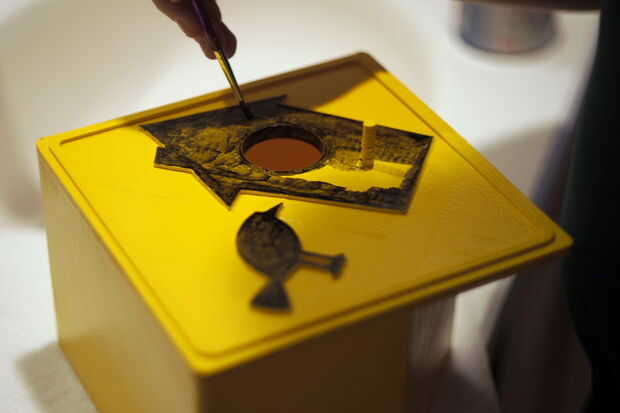 Después de que seca, comenzamos la parte superior de la decoración levantada con una pintura negro brillante pintado a mano. Que la pintura no cubren así como la pintura en aerosol amarillo, pero 2-4 capas dio un sólido acabado en negro brillante.