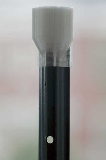 El diseño de la parte es mount.stl de http://www.thingiverse.com/thing:92431, aunque también puede utilizar la versión del Personalizador allí diseñar un montaje con una diversa profundidad de la ranura que tiene la parte superior de la U-post. La profundidad del defecto es aproximadamente 2 pulgadas. Hemos descubierto este diseño de montaje es muy específica al puesto particular utilizamos; para mantener a la gente de ser decepcionado cuando no cabe su post, la versión 3, http://www.thingiverse.com/thing:117929 , ya no incluye el montaje.