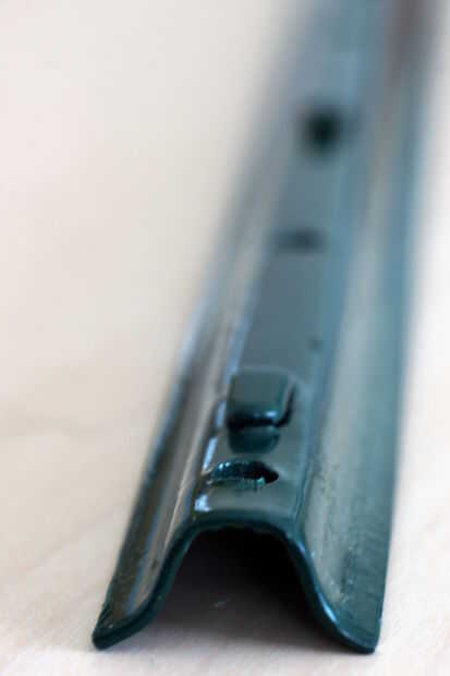 Para un uso normal, casi reducida perfecta a un cartel de carretera es un "verde metal U-post - no necesita la versión más pesada en forma de T. Estos postes metálicos pintados se pretenden garantizar en el vallado, pero son realmente muy versátiles y generalmente costo entre $2 y $6 dependiendo de la altura. Se advierte que existen algunas variantes con diferente sección formas... el que se muestra aquí es de Lowe.