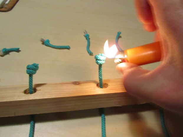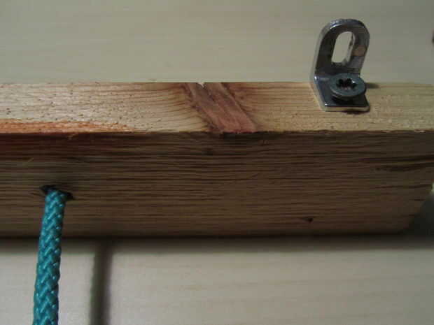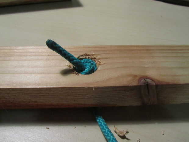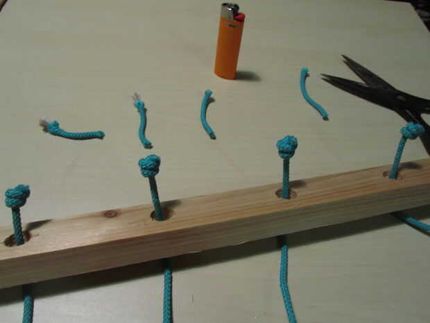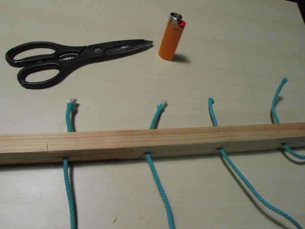 La altura de mi ventana es 43", así que até mis nudos, mide longitudes de paracord 48" para dar un respiro (que te recortarlo hasta más adelante mientras está colgado). Cortar los extremos en la base de los nudos y usa un encendedor para derretir el cable deshilachado. Necesitaba una manera de colgar el tablero. Pude has solo perforado algunos tornillos en los extremos, pero opté por usar algunos soportes pequeños que tuve puesta alrededor.