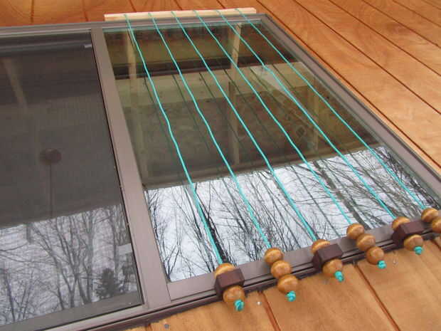 El dispositivo funciona muy bien, pero probablemente no es para todo el mundo. Aunque el paracord no impide la vista, puedo ver donde cuerdas colgando de una ventana de la imagen podrían ser una monstruosidad. Hay una alternativa a la paracord; utilizando monofilamento de pesca supuestamente es casi tan eficaz. Los filamentos espaciados en 3 pulgadas aparte y colgar 5 pulgadas desde el panel de la ventana. Sin embargo, basado en experimentos revisados, el método de paracord sigue siendo el método más seguro y más confiable para proteger aves de colisiones de la ventana. Como siempre, preguntas y comentarios son bienvenidos y alentados. Gracias por el interés y ayudar a salvar a nuestras aves.