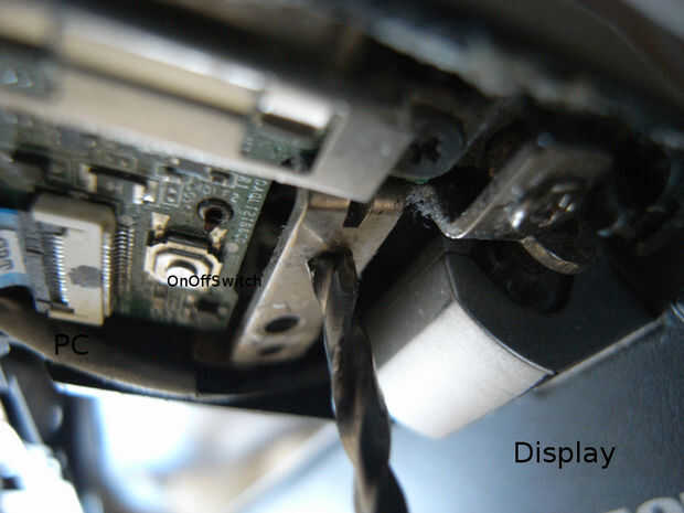 Hacer el agujero del metal de la bisagra-Monte grande 3mm (es, decir, 2.7 mm). Perforar hacia abajo, para mantener el polvo de metal caída de la laptop y no dentro.