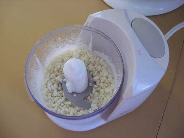 Raspar la masa hacia abajo en la parte inferior del recipiente, cubra con envoltura plástica y enfriar en la nevera por al menos 30 minutos. Esto hace mucho más fácil de manejar para el siguiente paso.