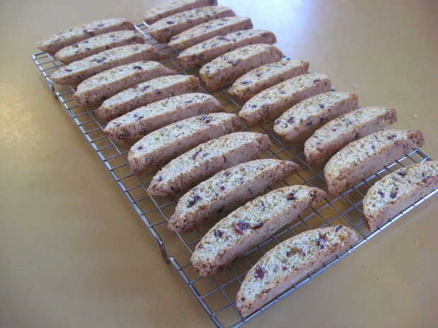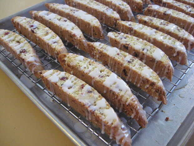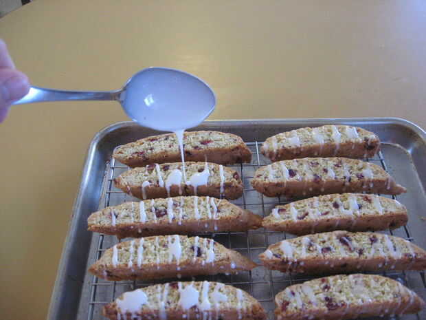 Coloque la bandeja de enfriamiento llena de bizcochos en las galletas (o sobre una hoja de papel encerado) para atrapar las gotas. Con una cuchara grande, salsear la guinda 3 ó 4 bizcochos a la vez. Asegúrese de que el bizcocho no toca así la guinda tiene espacio para salpicar sobre los lados, también.