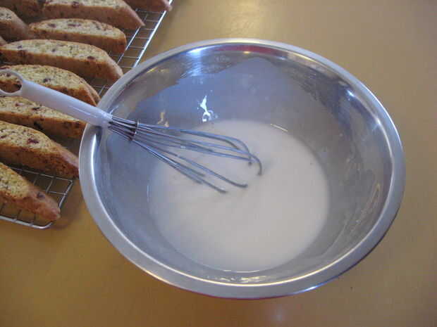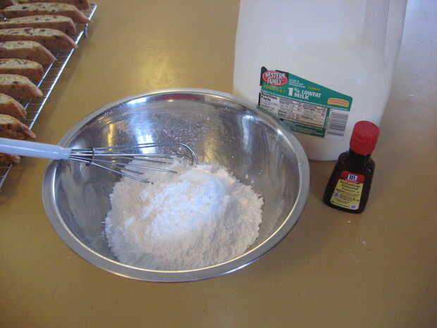 Batir el azúcar en polvo, 2 cucharadas de leche y el extracto de almendra. Añadir más leche un poco a la vez para llegar a una bonita, rociar consistencia.