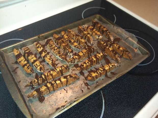 Llovizna el chocolate sobre el bizcocho cocido después que se sienta, el chocolate se endurecerá en el biscotti "todavía caliente"