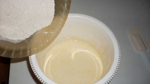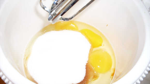 Batir la mantequilla, azúcar, sal, vainilla y polvo de hornear hasta que la mezcla esté suave y cremosa. Batir los huevos; la mezcla puede parecer ligeramente cuajada.