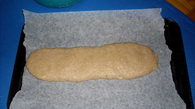 PLOP la masa sobre la bandeja para hornear preparada. Dividir por la mitad y la forma en dos registros