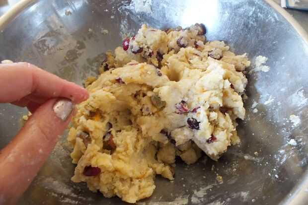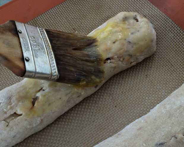 Usando sus manos remodelar el rollo y presione suavemente por encima para aplanar la masa. Cepillo de cualquier exceso de harina.