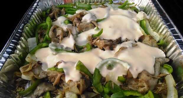 A continuación tomar una lata de aluminio de tamaño mediano y coloque sobre la parrilla a fuego alto. Cubrir el fondo con aceite de oliva y agregue cebollas, pimientos y ajo. La parrilla a fuego alto hasta que se ablanden. Mientras se cocinan verduras comienzan a hacer salsa de queso provolone. Hacer un roux por derretir la mantequilla en una olla y batir en cuatro hasta que haga una pasta espesa. A continuación añadir en alrededor de 3 tazas de leche y bata hasta que espese. Añadir 1/4 libra de queso provolone, sal, pimentón, ajo en polvo. Dejar reposar a fuego lento.